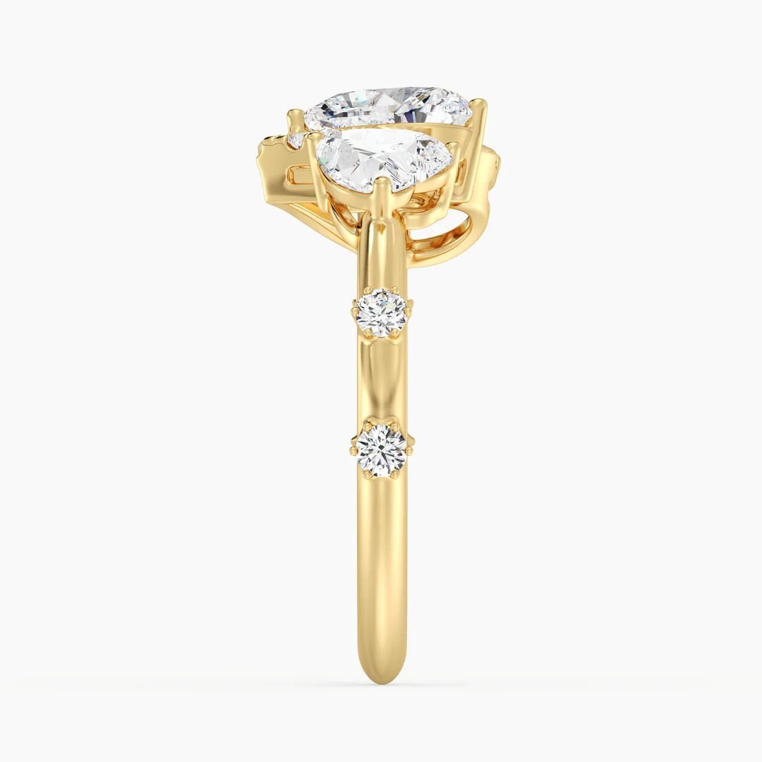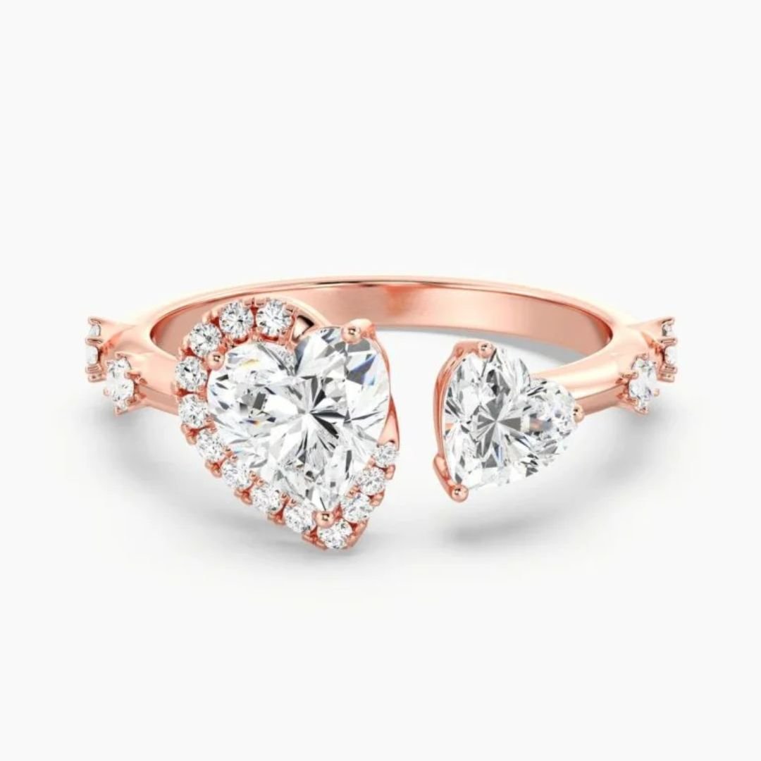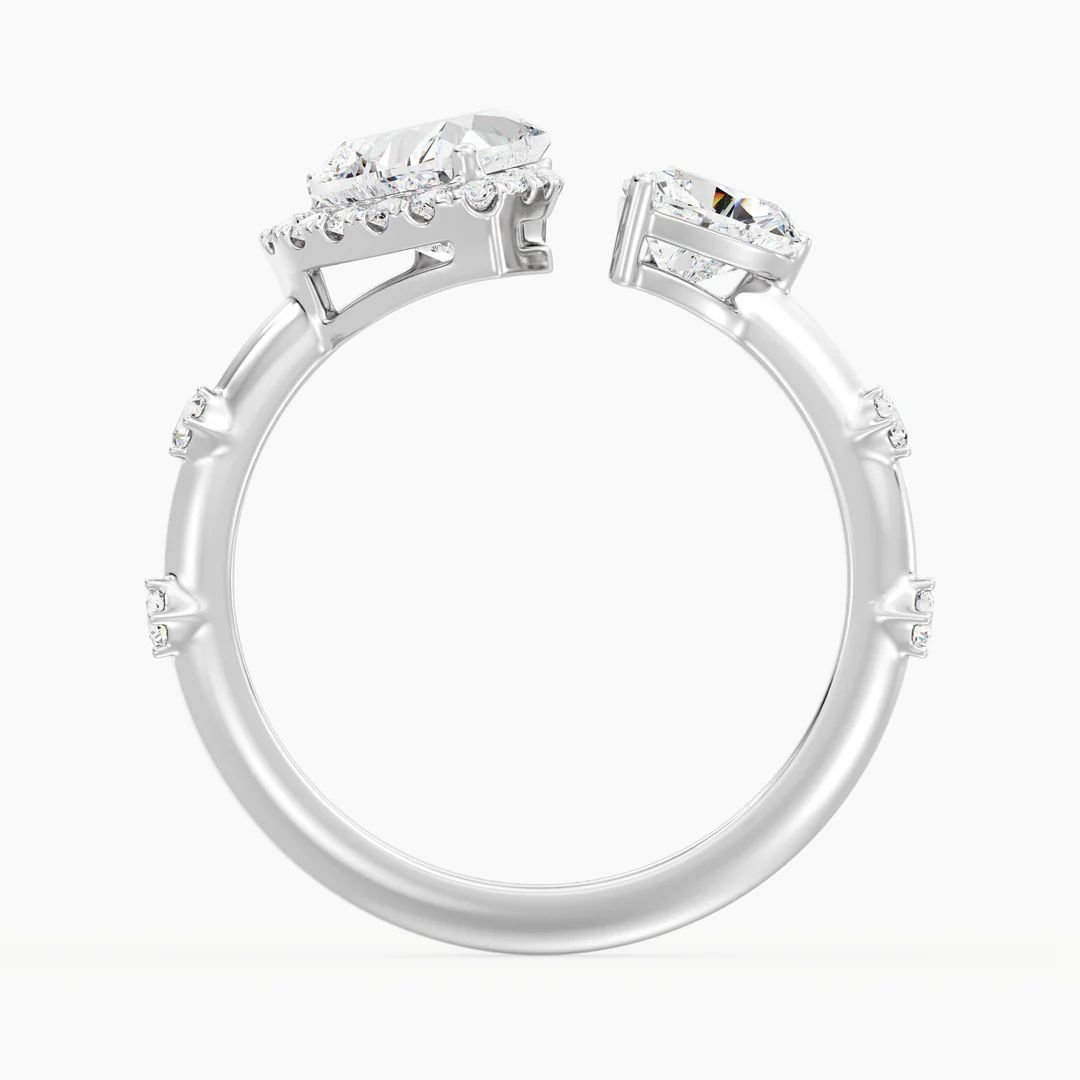 One side of this ring is adorned with a 1.00ct heart-cut lab-grown diamond, while the other features a 0.50ct heart-cut lab-grown diamond, creating a harmonious balance of size and sparkle. Enhancing its brilliance, 17 round lab-grown accent diamonds totaling 0.26ct are pavé-set along the open cuff band, adding a radiant finishing touch. Expertly crafted in 18K solid gold and available in yellow, white, or rose gold, this design can also be custom-made with alternative diamond shapes or carat weights, making it a truly unique expression of your love story.