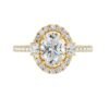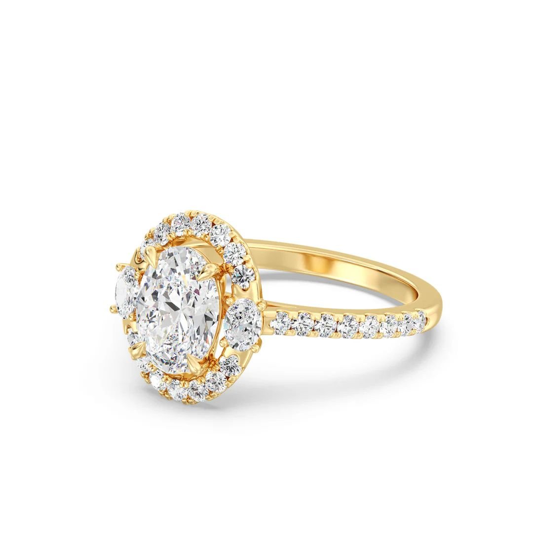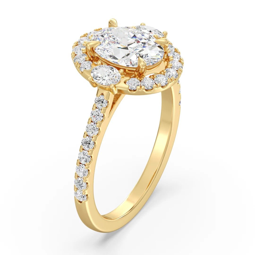 Make a statement with this 1.50ct Oval-Cut lab-grown diamond, accented by a scalloped halo and pavé shank. Two side ovals (0.24ct) and 30 round diamonds (0.45ct) complete the design. Crafted in 18K Yellow, White, or Rose Gold.